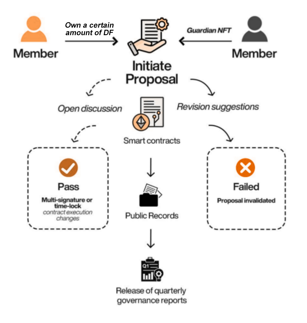 vote(uint256 proposalId, bool agree);Voting weight sources: mapped from node identities or long-term DF token holders;